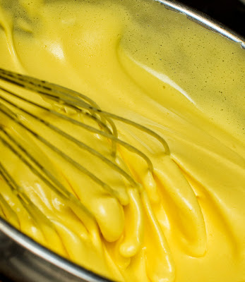 Hacemos un baño maría con las yemas batidas y con el azúcar, cuando hayan alcanzado los 50º (cuando estén bien calientes) añadimos el vino blanco y mezclamos